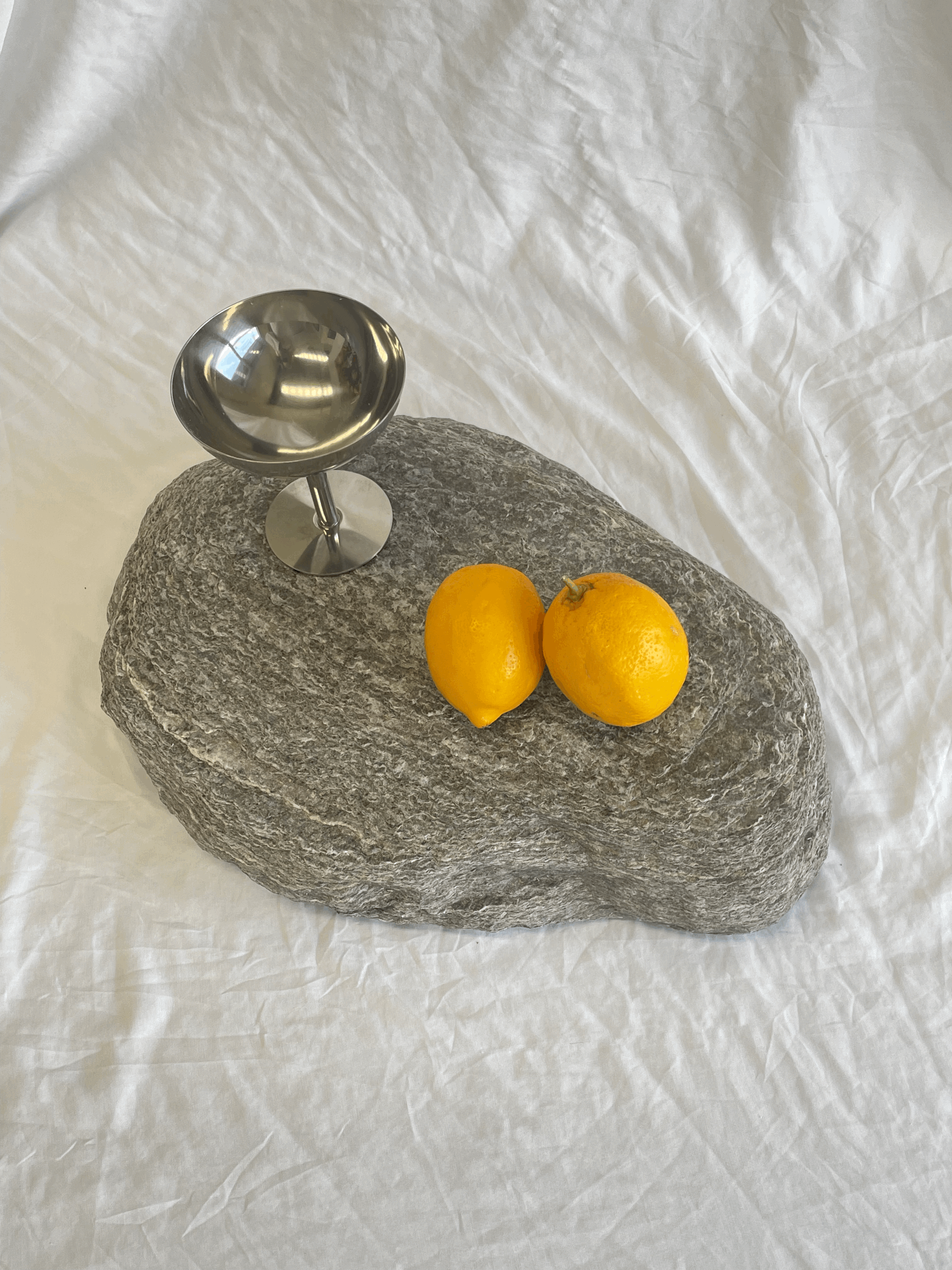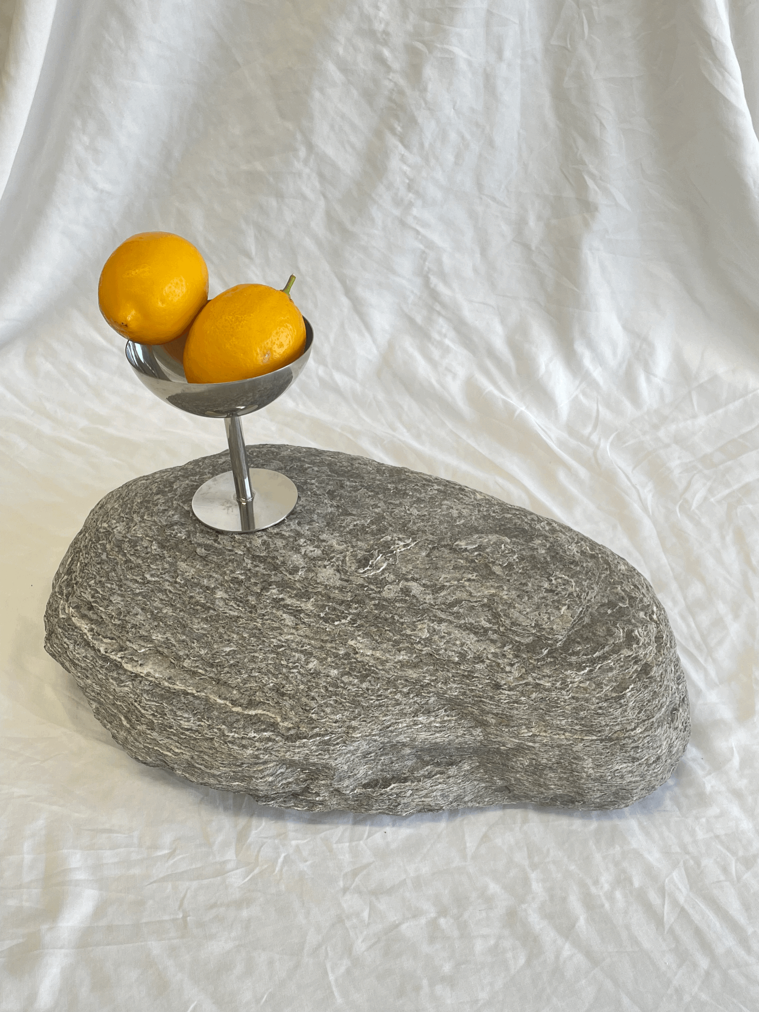 A rock with two yellow lemons and a stainless steel cup on top of it, placed on a white fabric surface.